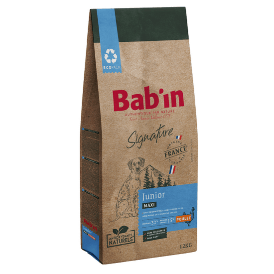 Les croquettes BAB’IN Signature Maxi Junior au poulet sont spécialement conçues pour répondre aux besoins nutritionnels des chiots de grande taille en pleine croissance. Grâce à une formule riche en protéines de poulet de haute qualité, elles soutiennent le développement musculaire et osseux de votre chiot, tout en favorisant une croissance harmonieuse. L’ajout d'acides gras essentiels (oméga 3 et 6) assure une peau saine et un pelage brillant, tandis que la combinaison de fibres naturelles et de prébiotiques favorise une digestion optimale et soutient les bonnes bactéries intestinales. Formulées pour accompagner le développement de vos compagnons tout au long de leur phase de croissance, ces croquettes leur apportent l’énergie nécessaire pour une vie active et saine. Format : Sac de 12 kg – Disponible à La Réunion.