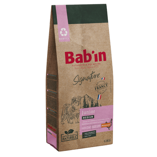 Les croquettes BAB’IN Signature Medium Junior au poulet sont spécialement formulées pour les chiots de taille moyenne en pleine croissance. Composées de protéines de poulet de haute qualité, elles apportent tous les nutriments essentiels pour soutenir le développement musculaire et osseux de votre chiot. Grâce à leur formulation riche en acides gras essentiels (oméga 3 et 6), elles favorisent une peau saine et un pelage doux et brillant. Les fibres naturelles et les prébiotiques contribuent à une digestion saine et à une flore intestinale équilibrée. Ces croquettes sont conçues pour accompagner votre chiot dans sa croissance tout en lui apportant l’énergie nécessaire pour des journées actives et pleines de découvertes. Format : Sac de 12 kg – Disponible à La Réunion.
