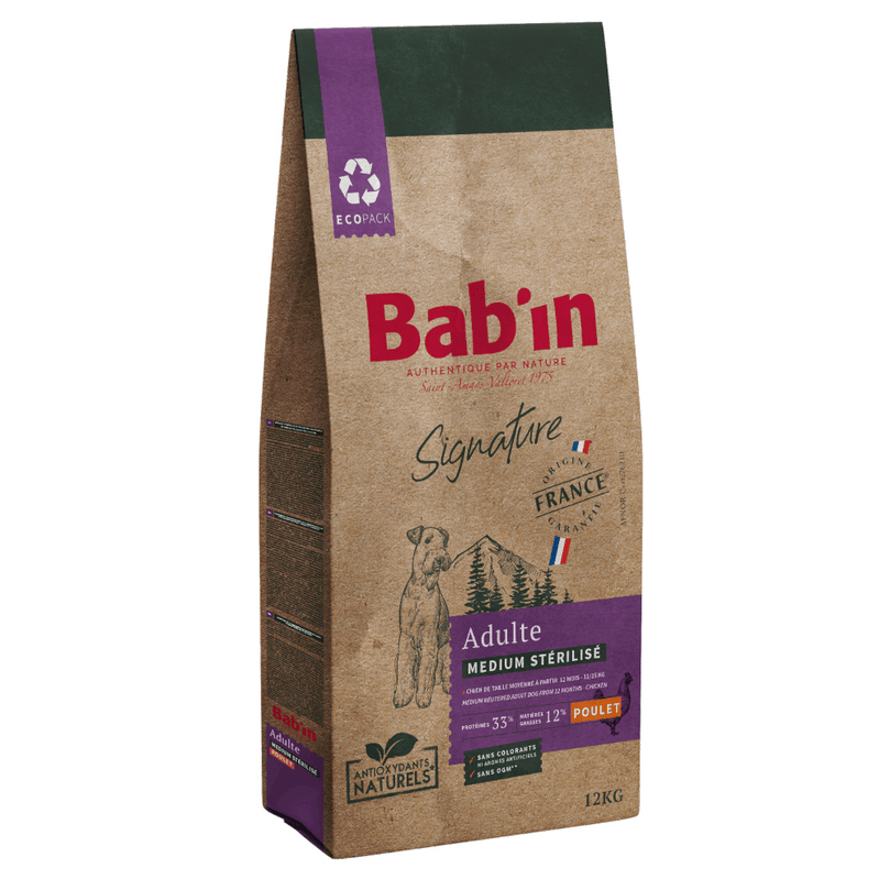 Les croquettes BAB’IN Signature Medium Sterilised au poulet sont spécifiquement formulées pour les chiens adultes de taille moyenne ayant été stérilisés. Enrichies en protéines de poulet de haute qualité, elles aident à maintenir un poids de forme optimal tout en soutenant la masse musculaire. Leur faible teneur en graisses, combinée à des fibres naturelles et prébiotiques, favorise la satiété et la gestion du poids, tout en maintenant une digestion saine. Ces croquettes sont également renforcées en acides gras essentiels (oméga 3 et 6), pour une peau saine et un pelage brillant. Elles sont idéales pour accompagner les chiens stérilisés dans leur quotidien, en leur apportant une alimentation équilibrée adaptée à leur métabolisme. Format : Sac de 12 kg – Disponible à La Réunion.